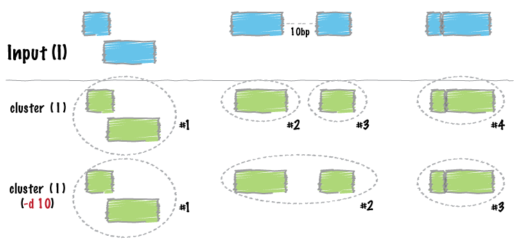 bedtools cluster [OPTIONS] -i <BED/GFF/VCF>