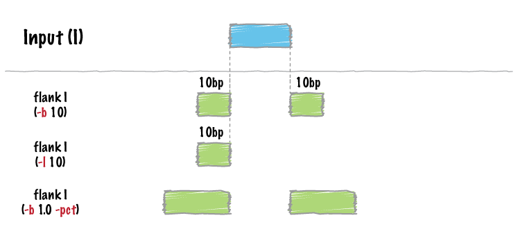 $ bedtools flank -i A.bed -g my.genome -b 0.1 -pct