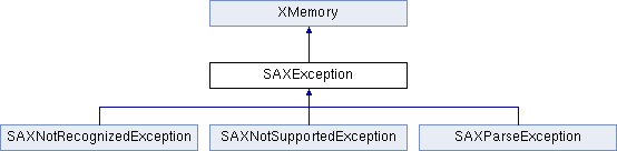 This class can contain basic error or warning information from either the XML SAX parser or the application: a parser writer or application writer can subclass it to provide additional functionality. SAX handlers may throw this exception or any exception subclassed from it.